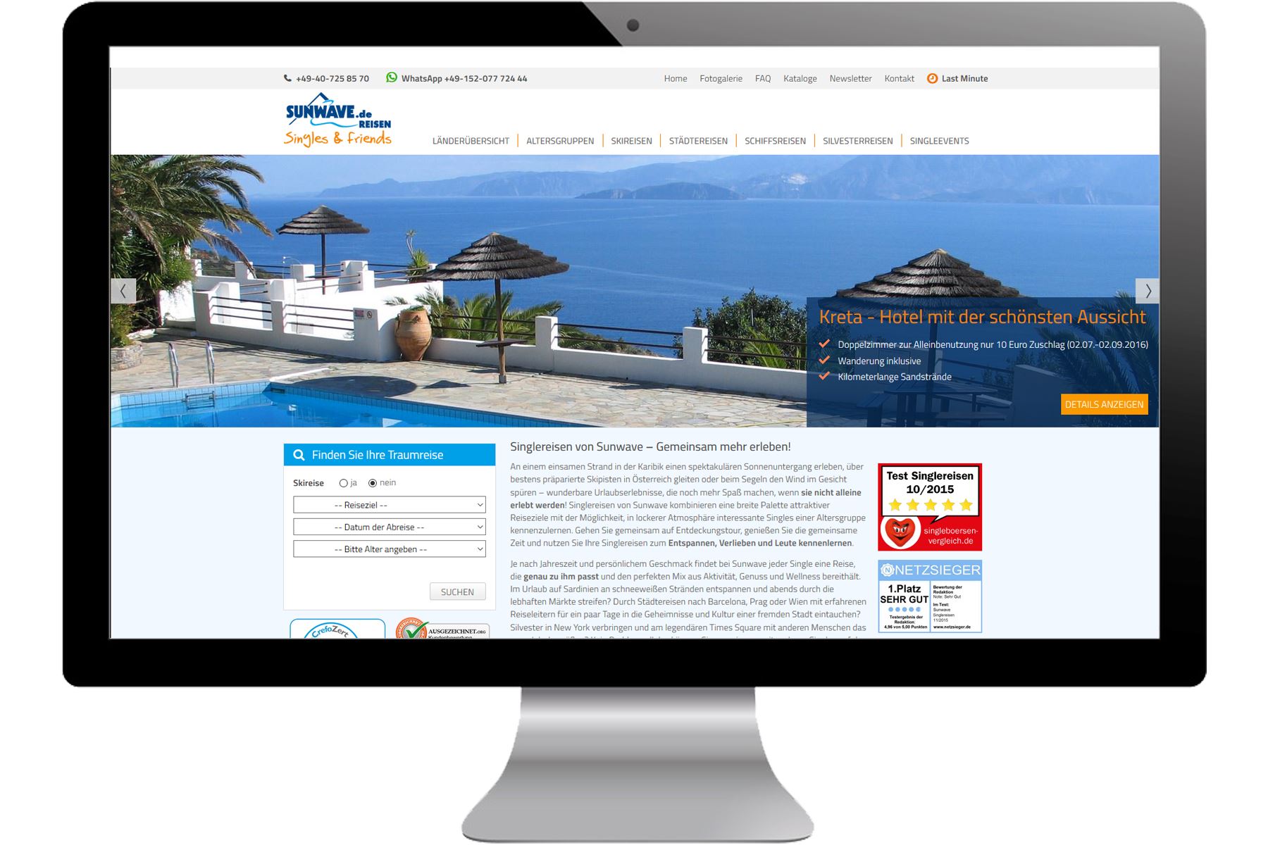 Umfassende Entwicklung eines Reiseportals für Singlereisen. Anbindung an Reisesoftware sowie Austausch von Reiseinformationen und Verfügbarkeiten mit weiteren Webseiten (White-Label), u. a. Eliteurlaub.